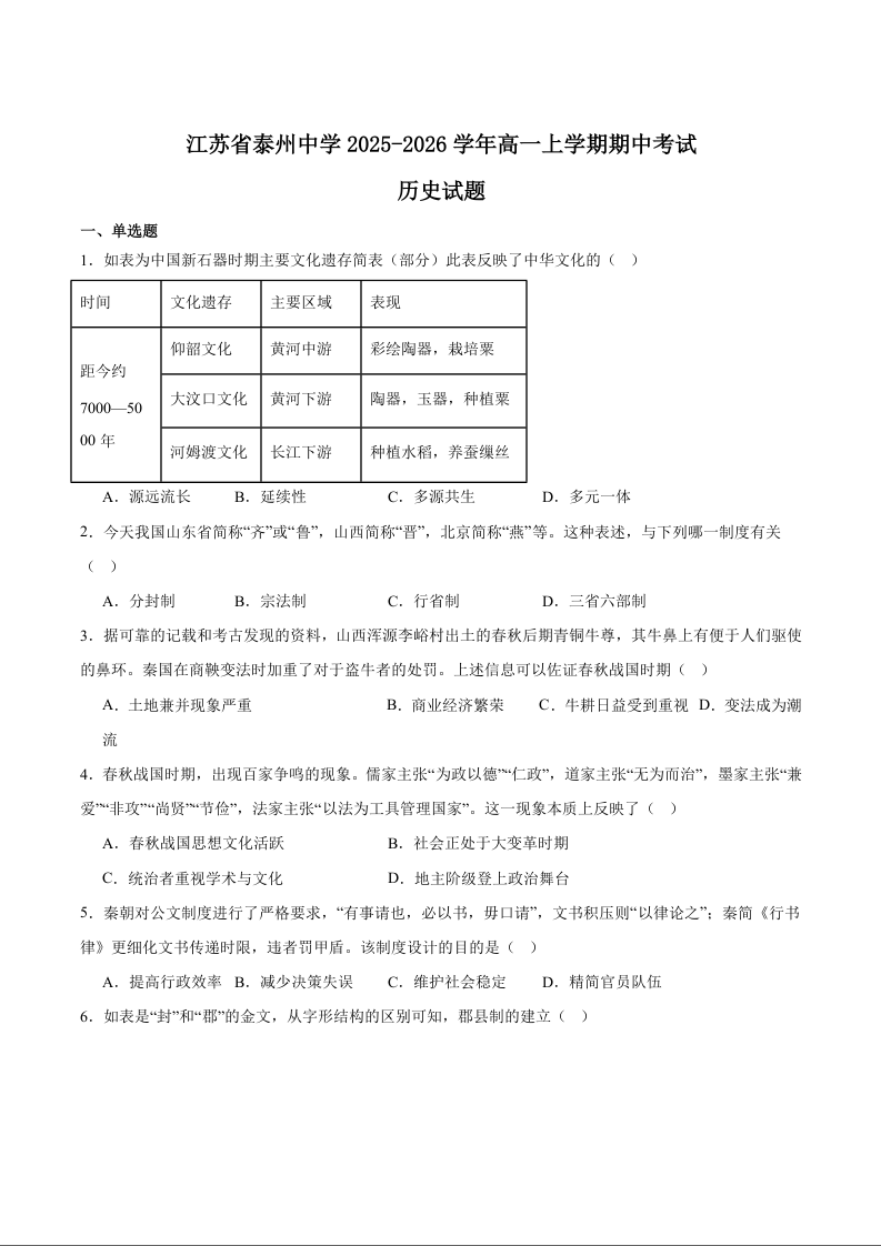 江苏省泰州中学2025-2026学年第一学期高一年级期中考试 历史试题(含答案).docx