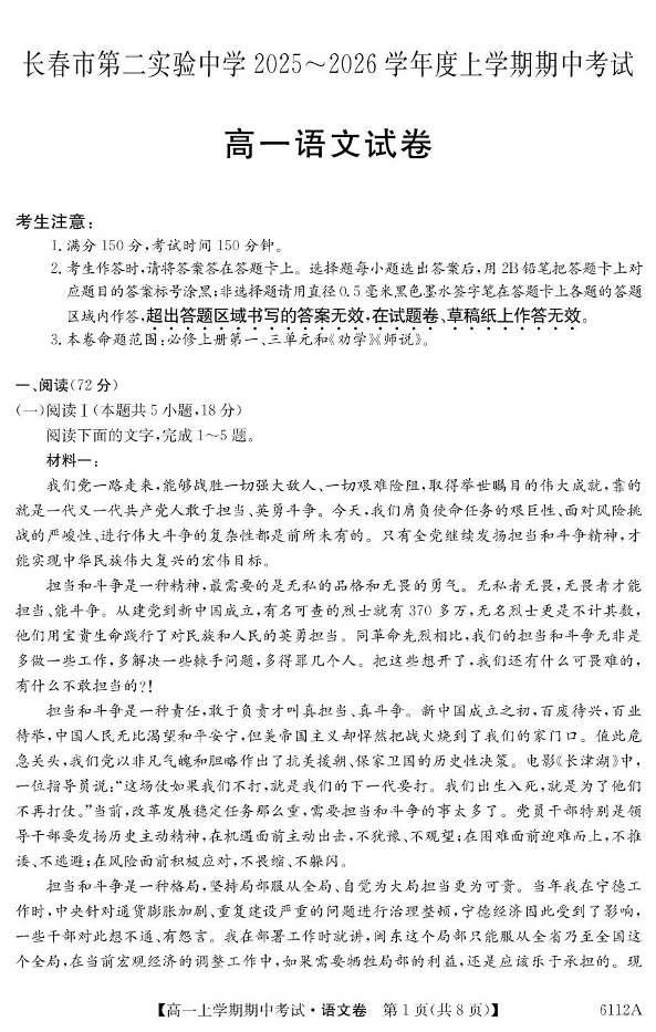 长春市第二实验中学2025-2026学年度高一上学期期中考试 语文试卷(含答案).pdf