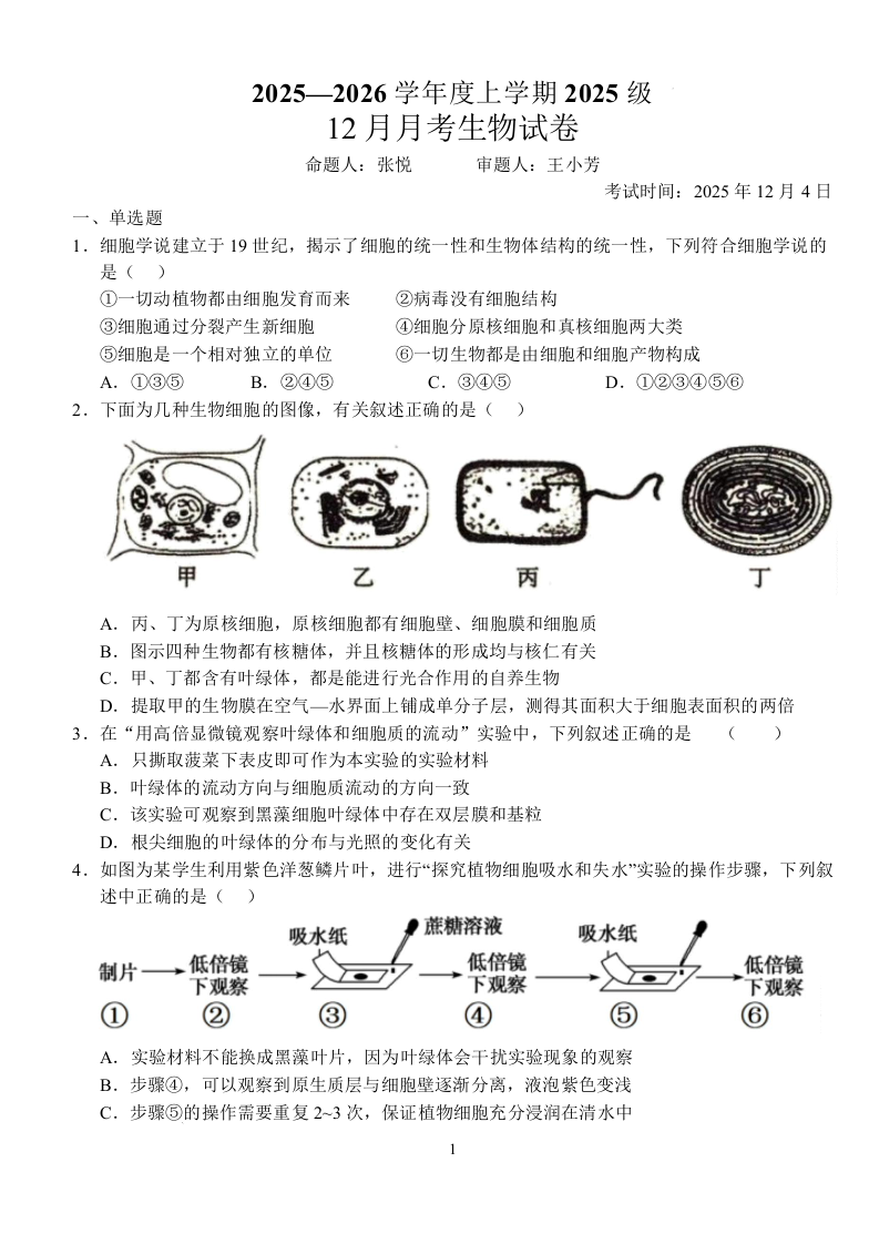 湖北省荆州市沙市中学2025-2026学年高一上学期12月月考 生物.docx