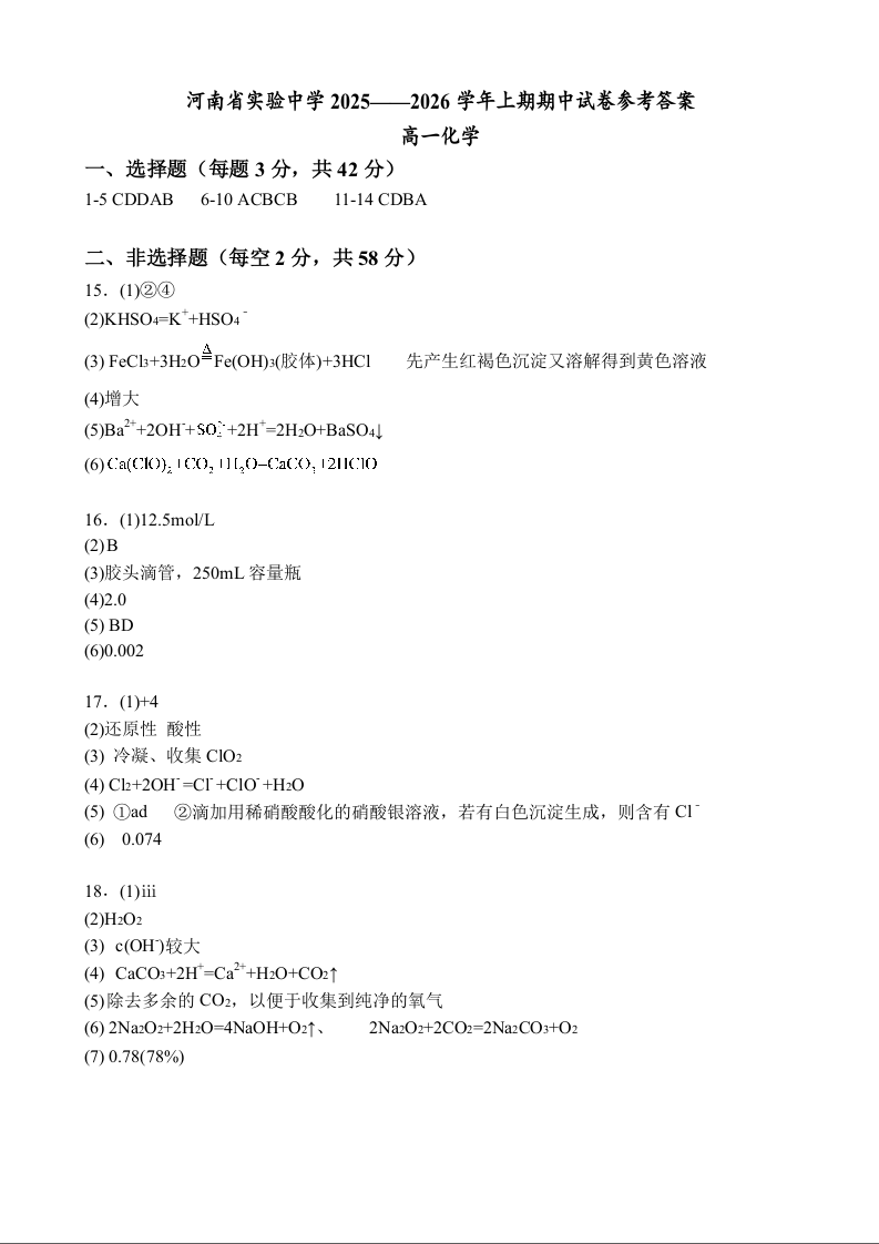 河南省实验中学2025-2026学年高一上学期期中考试 化学答案.docx