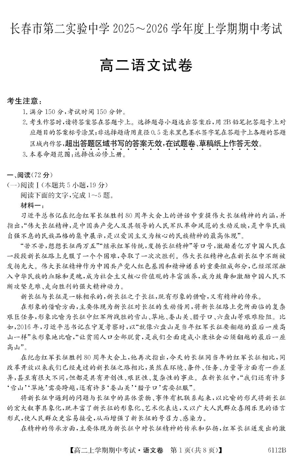 长春市第二实验中学2025-2026学年度高二上学期期中考试 语文试卷(含答案).pdf
