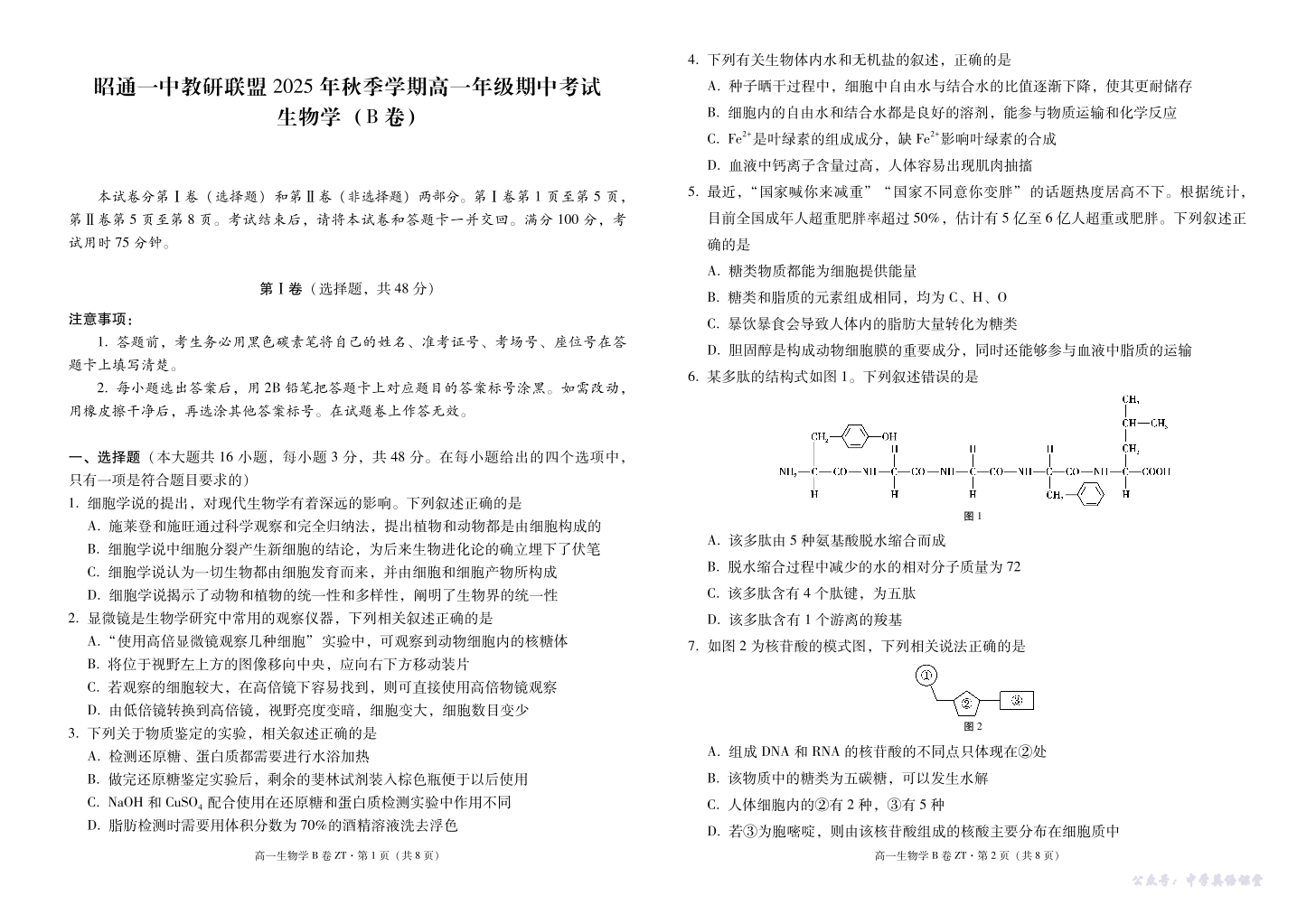 云南省昭通一中教研联盟2025-2026学年高一上学期期中考试 生物(B).pdf