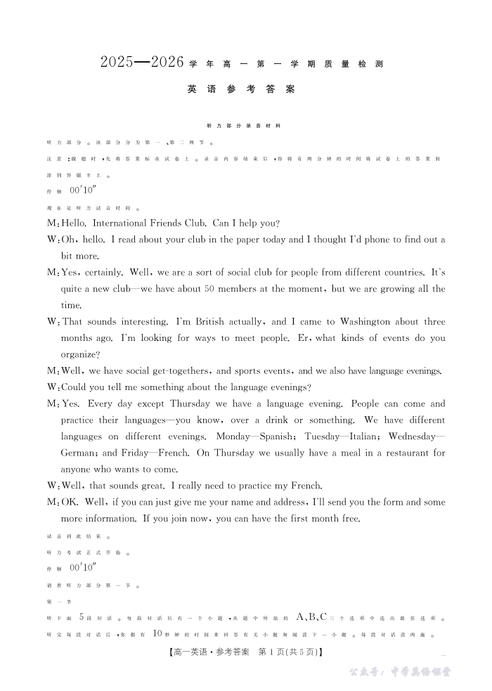 南平市2025-2026学年高一第一学期质量检测 英语答案.pdf