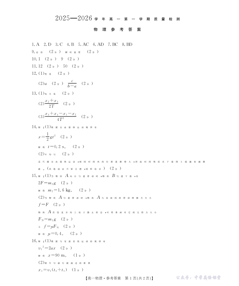 南平市2025-2026学年高一第一学期质量检测 物理答案.pdf