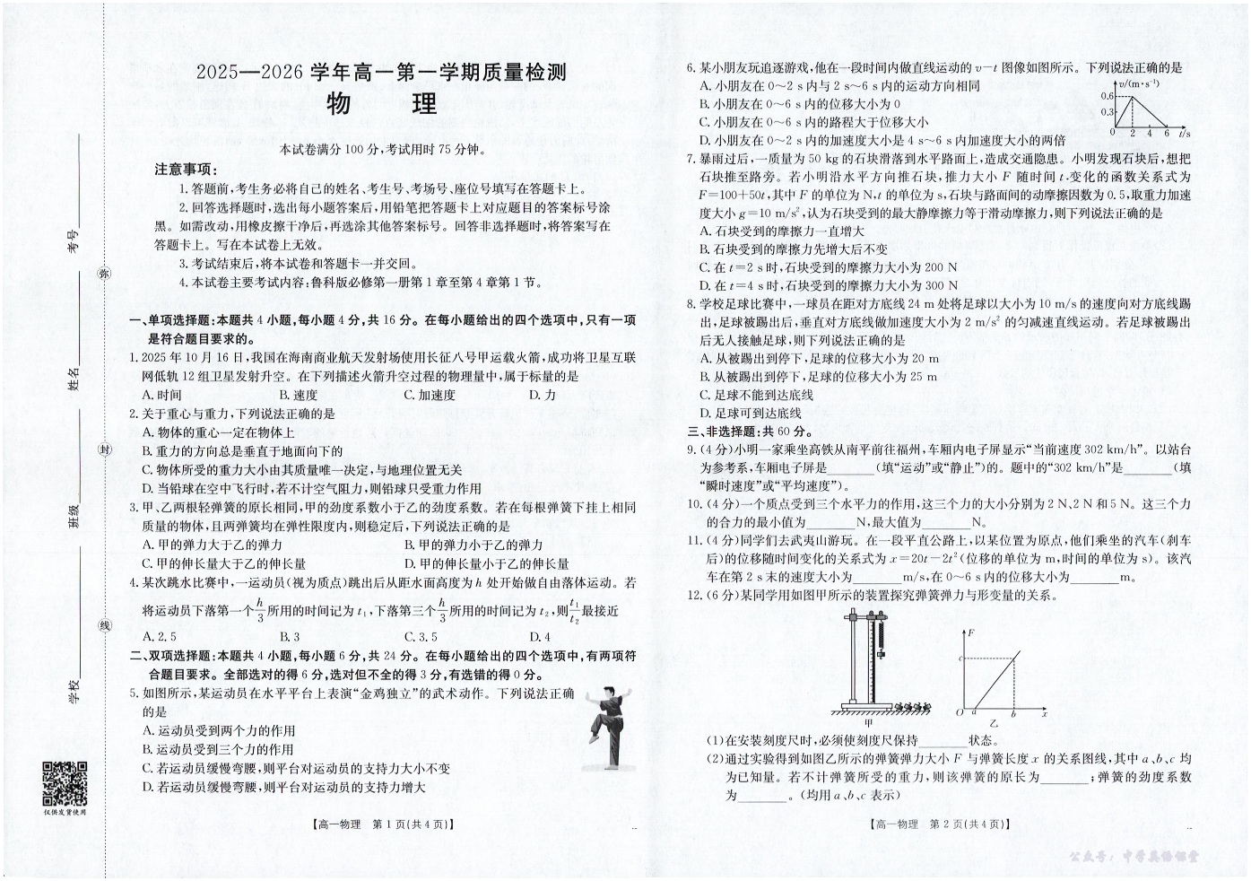 南平市2025-2026学年高一第一学期质量检测 物理.pdf