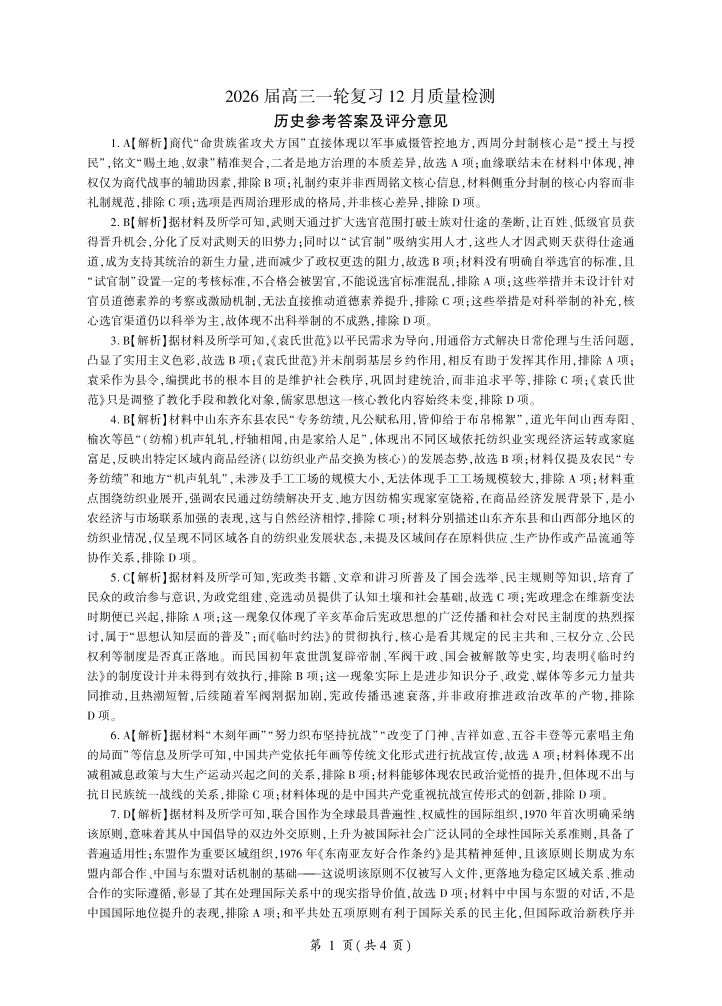 四川省百师联盟2026届高三一轮复习12月质量检测 历史答案.pdf
