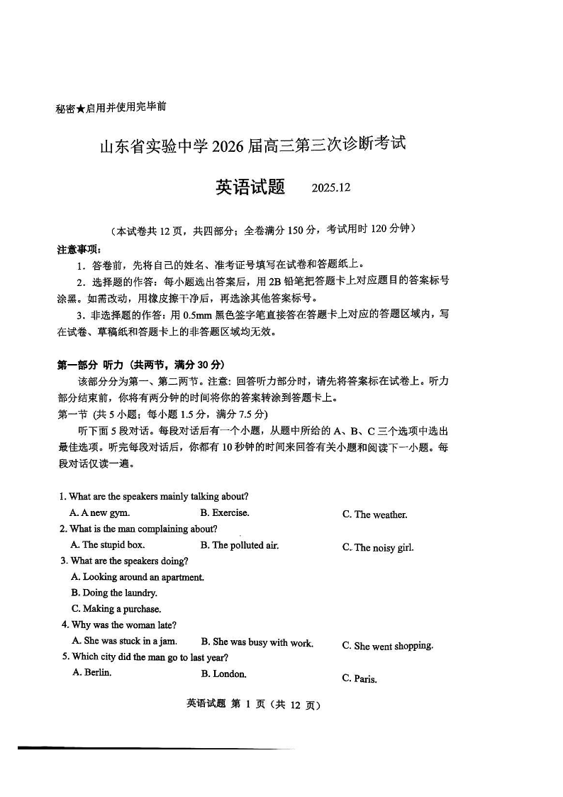 山东省实验中学2026届高三第三次诊断性考试 英语.pdf