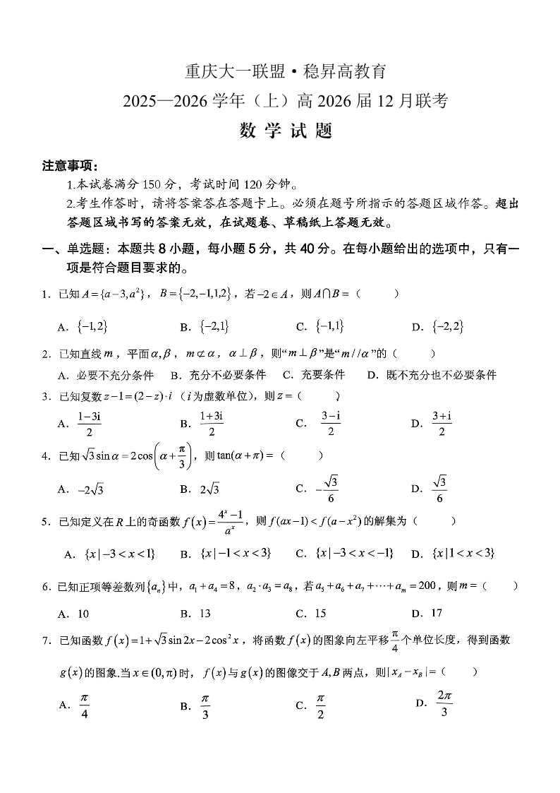 稳昇高教育2025-2026学年(上)高2026届12月联考 数学.pdf
