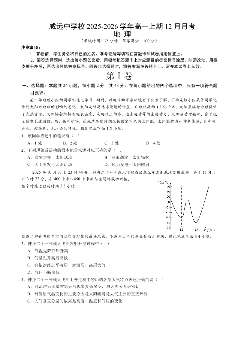 四川省内江市威远中学校2025-2026学年高一上学期12月月考 地理试题(含答案).docx