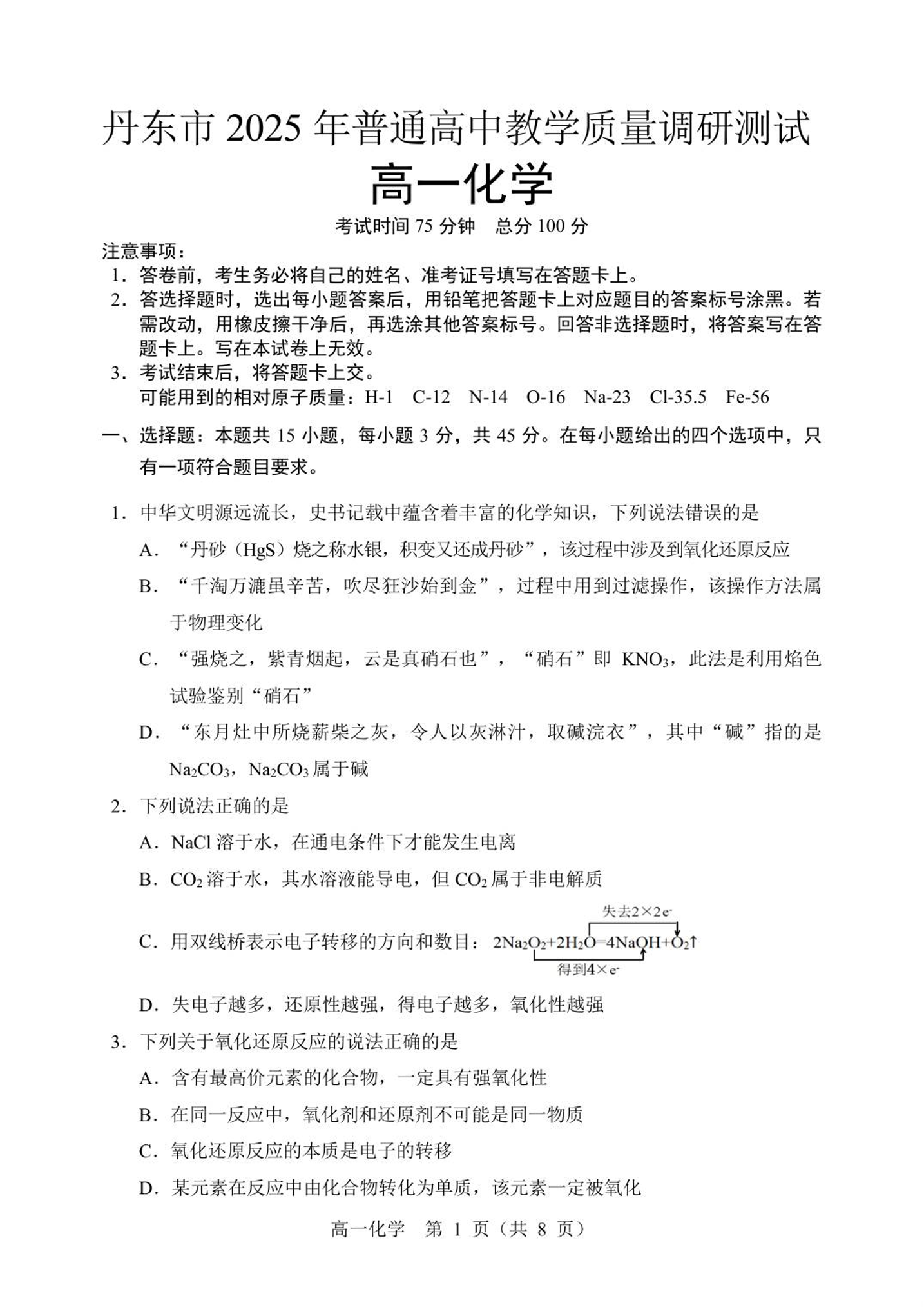 辽宁省丹东市2025-2026学年高一上学期教学质量调研测试 化学.pdf