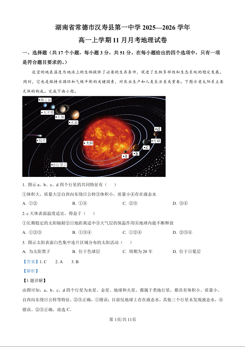 湖南省常德市汉寿县第一中学2025-2026学年高一上学期11月期中 地理答案.docx