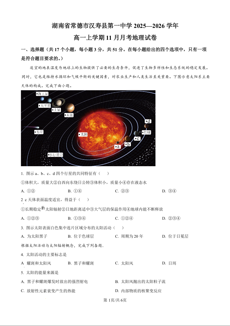 湖南省常德市汉寿县第一中学2025-2026学年高一上学期11月期中 地理.docx