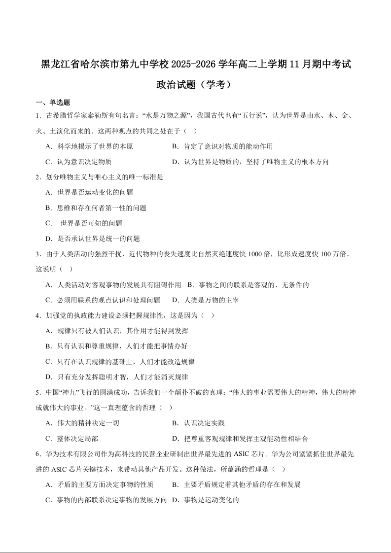 黑龙江省哈尔滨市第九中学2025-2026学年高二上学期期中考试 政治试题(含答案).docx
