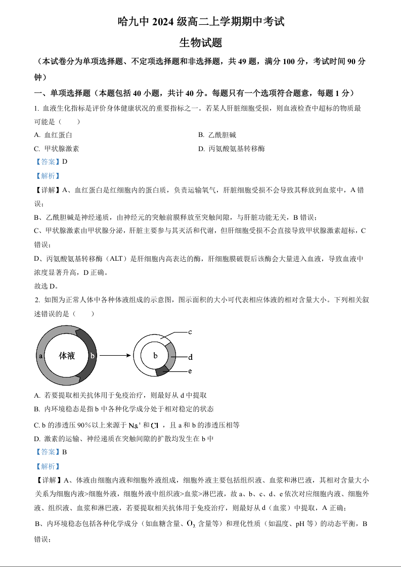 黑龙江省哈尔滨市第九中学2025-2026学年高二上学期期中考试 生物答案.docx