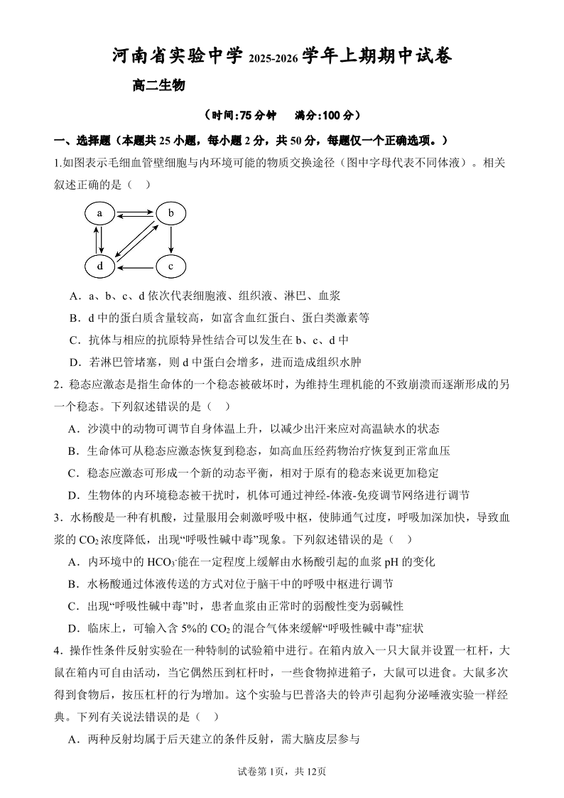 河南省实验中学2025-2026学年高二上学期期中考试 生物.pdf