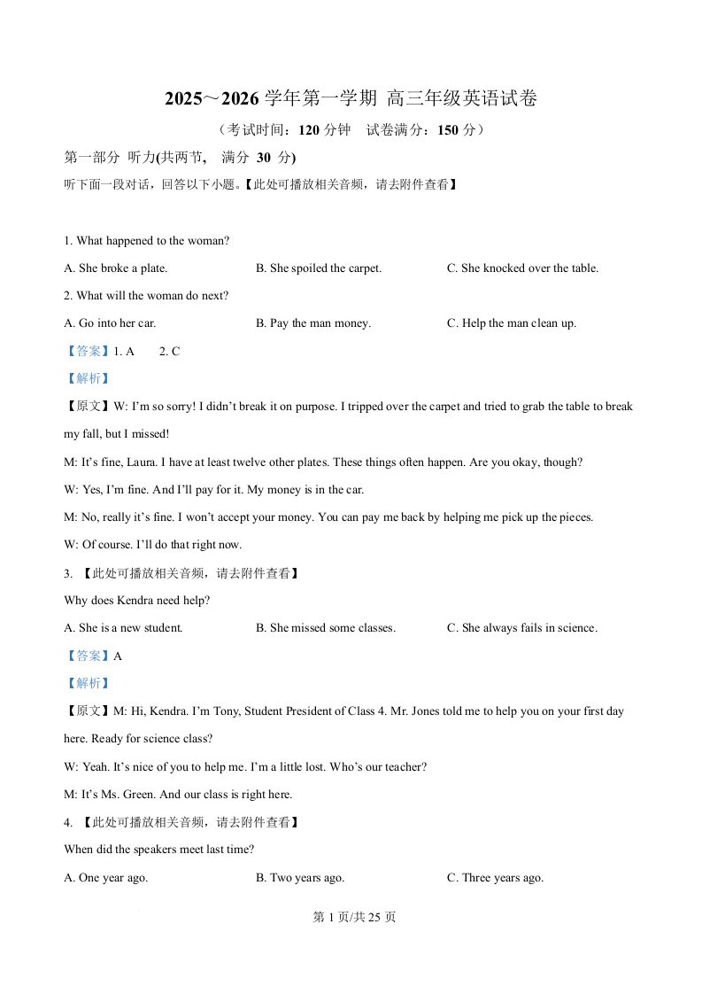 内蒙古自治区鄂尔多斯市第一中学2026届高三上学期12月月考 英语答案.docx