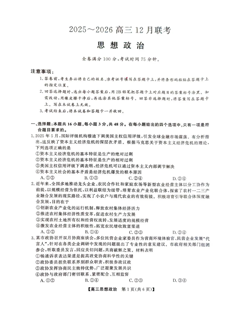 陕西省榆林市2025~2026学年度高三12月联考 政治.pdf