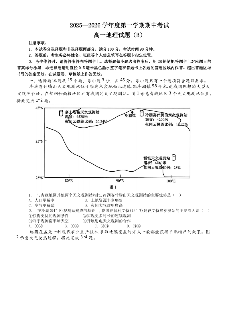 山东省菏泽市2025-2026学年高一上学期期中联考试题 地理(B)试题(含答案).docx