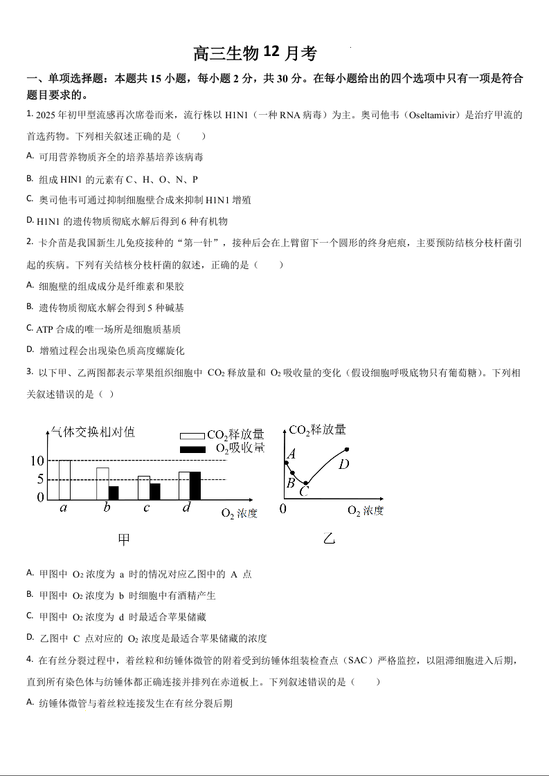 吉林省通化市梅河口市第五中学2025-2026学年高三上学期12月月考 生物试题(含答案).docx