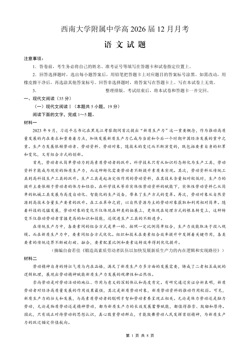 重庆西南大学附属中学高2026届高三12月月考 语文.pdf