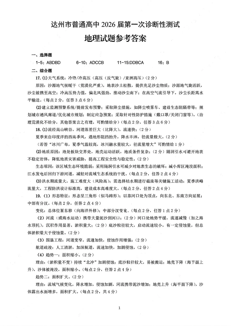 达州市普通高中2026届第一次诊断性测试 地理答案.pdf
