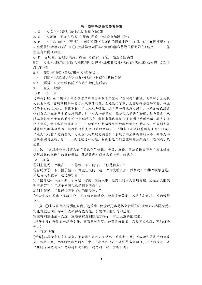 山东省济南第一中学2025-2026学年高一上学期期中学情检测 语文答案.pdf