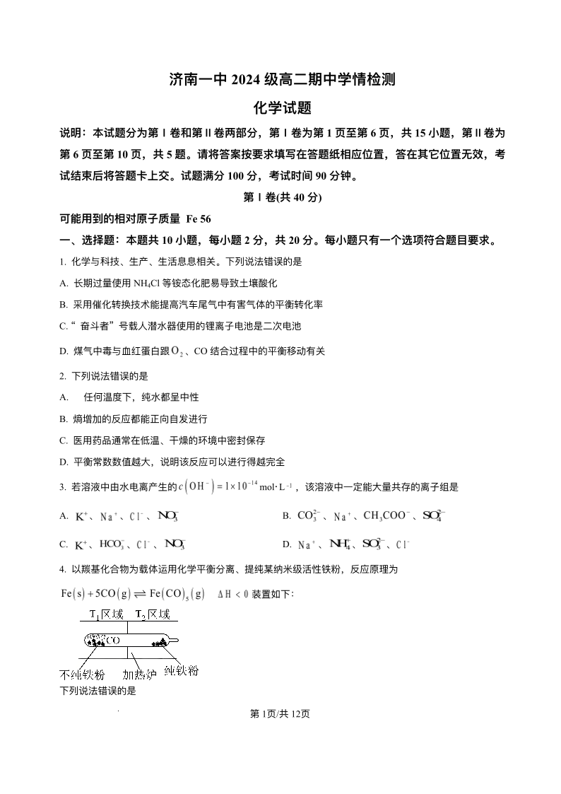 山东省济南第一中学2025-2026学年高二上学期期中学情检测 化学试题(含答案).pdf