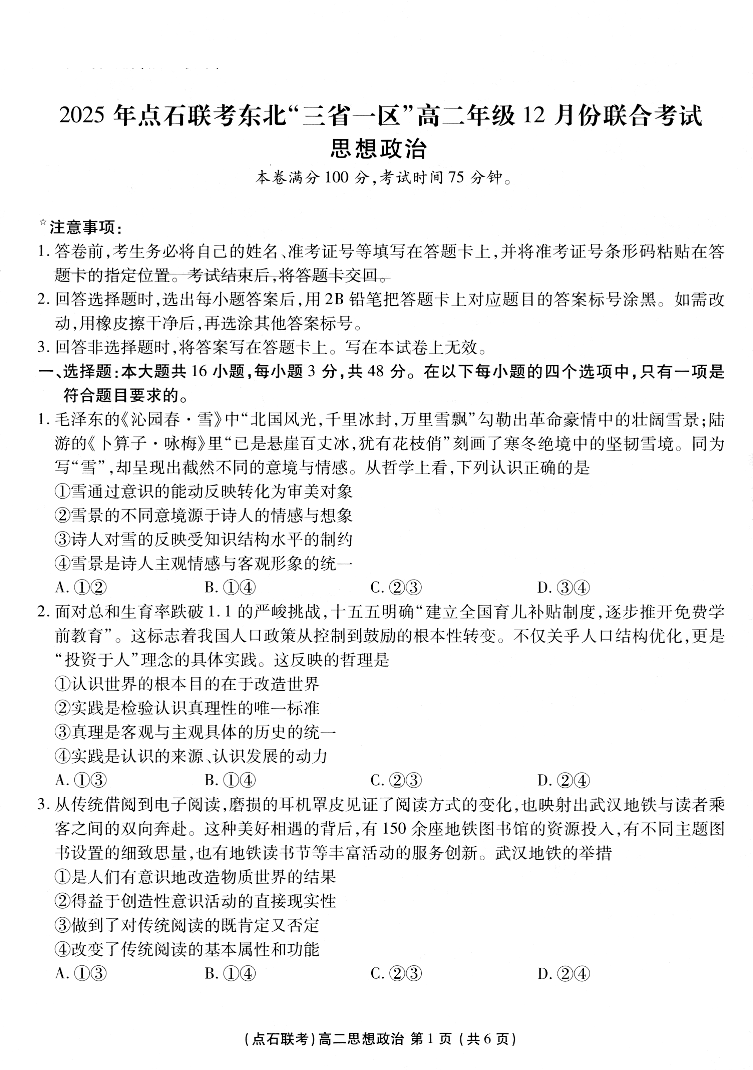 2025年点石联考东北“三省一区”高二年级12月份联合考试 政治试题(含答案).pdf