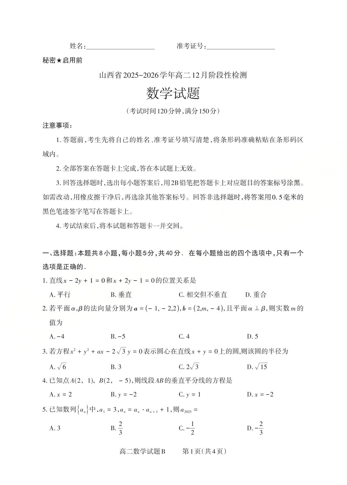 山西省三重教育2025-2026学年高二12月阶段性检测 数学(B卷).pdf