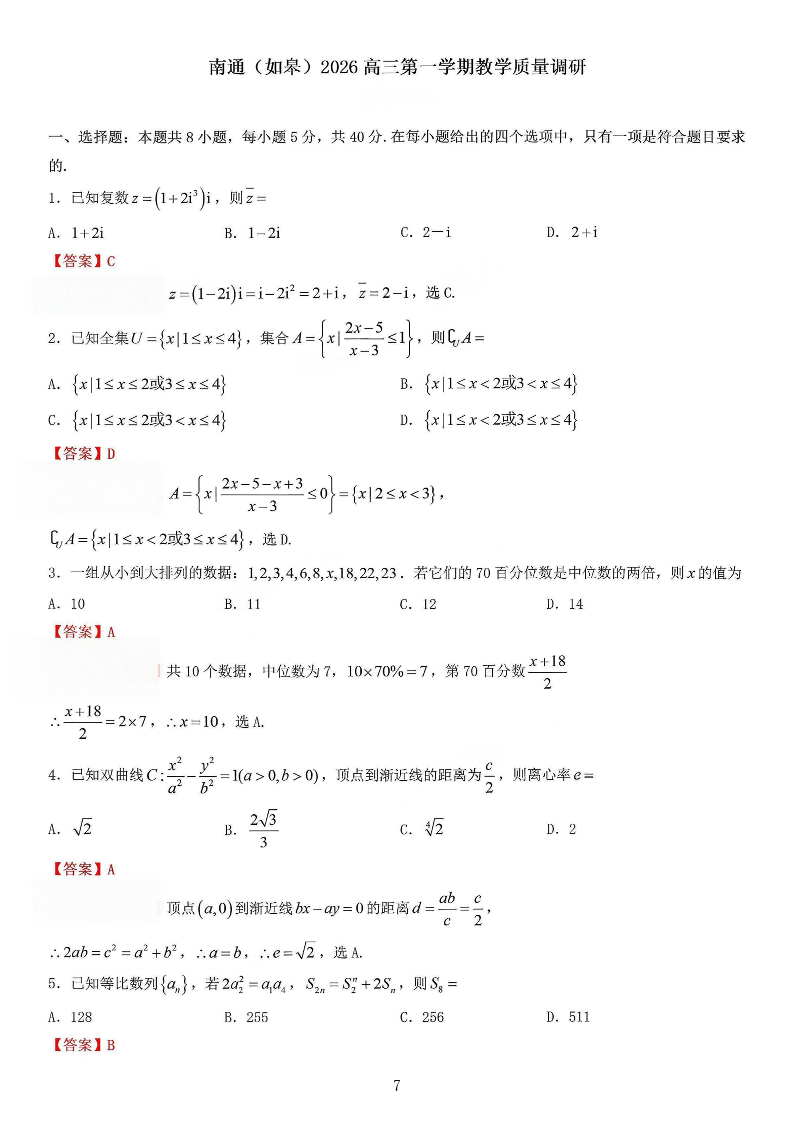 南通市、如皋市2025—2026学年度高三年级第一学期教学质量调研(二)数学答案.pdf