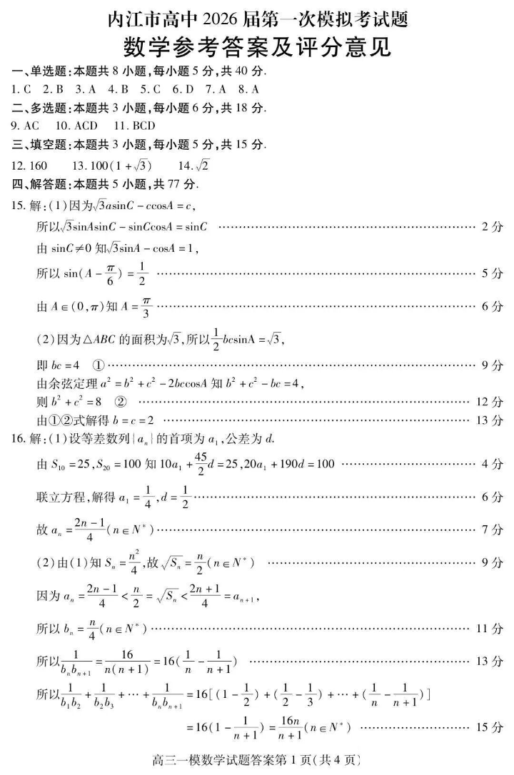 内江市高中2026届第一次模拟考试题 数学答案.pdf