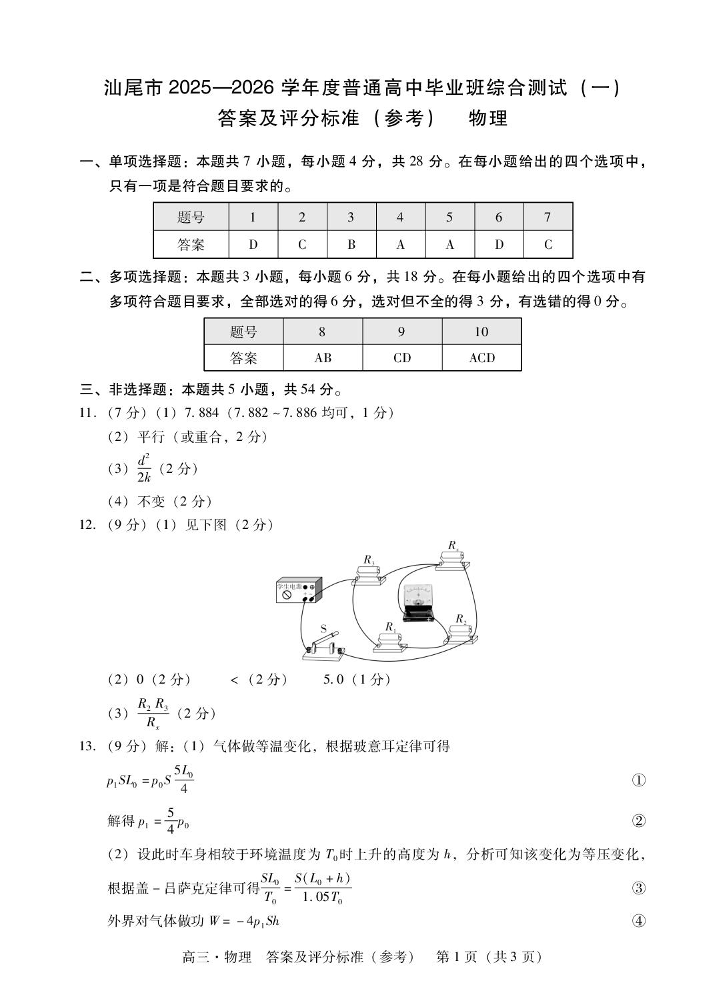 汕尾市2025—2026学年度普通高中毕业班综合测试(一)物理答案.pdf