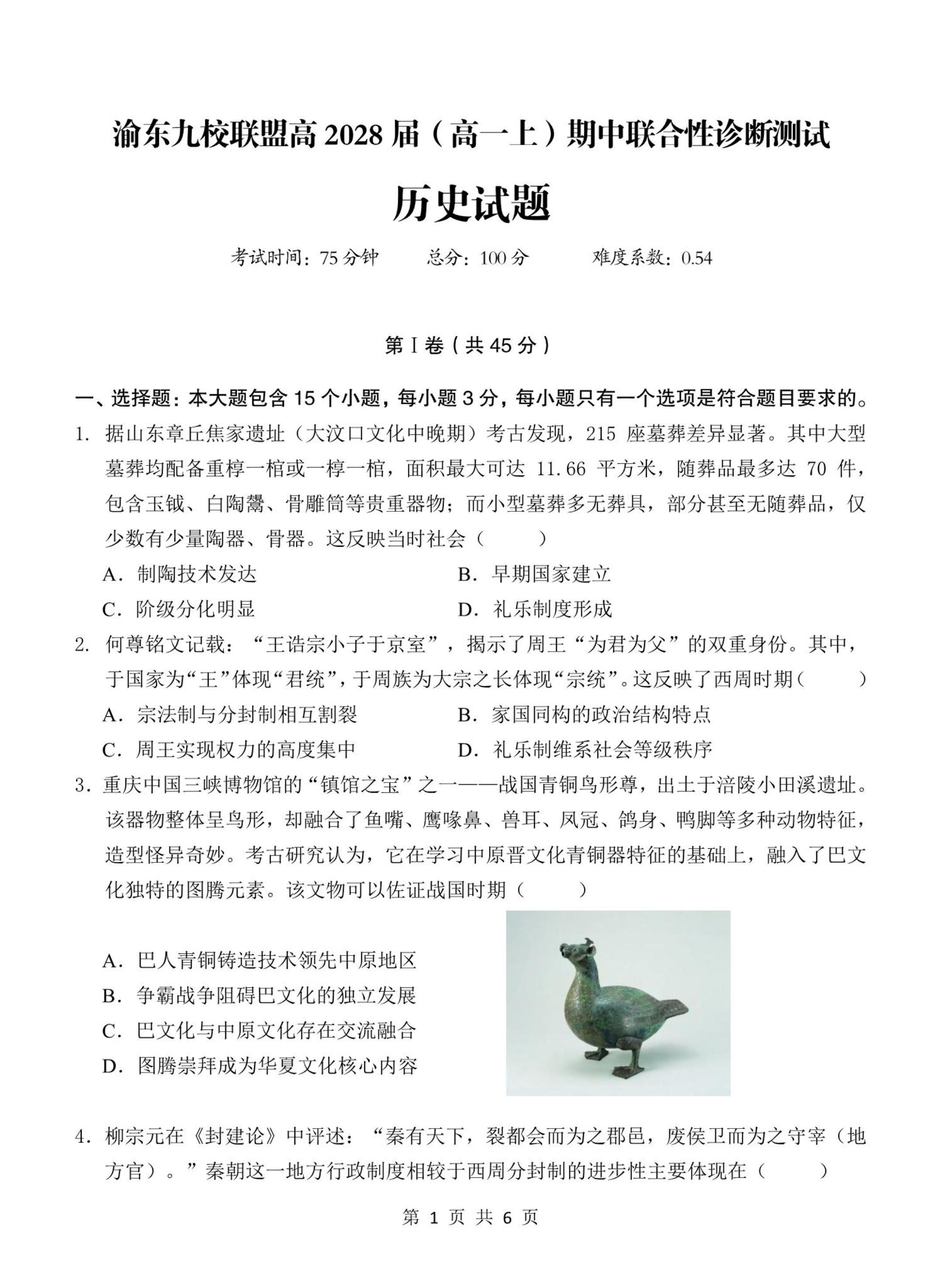 渝东九校联盟2028届(高一上)期中联合性诊断测试 历史试题(含答案).pdf