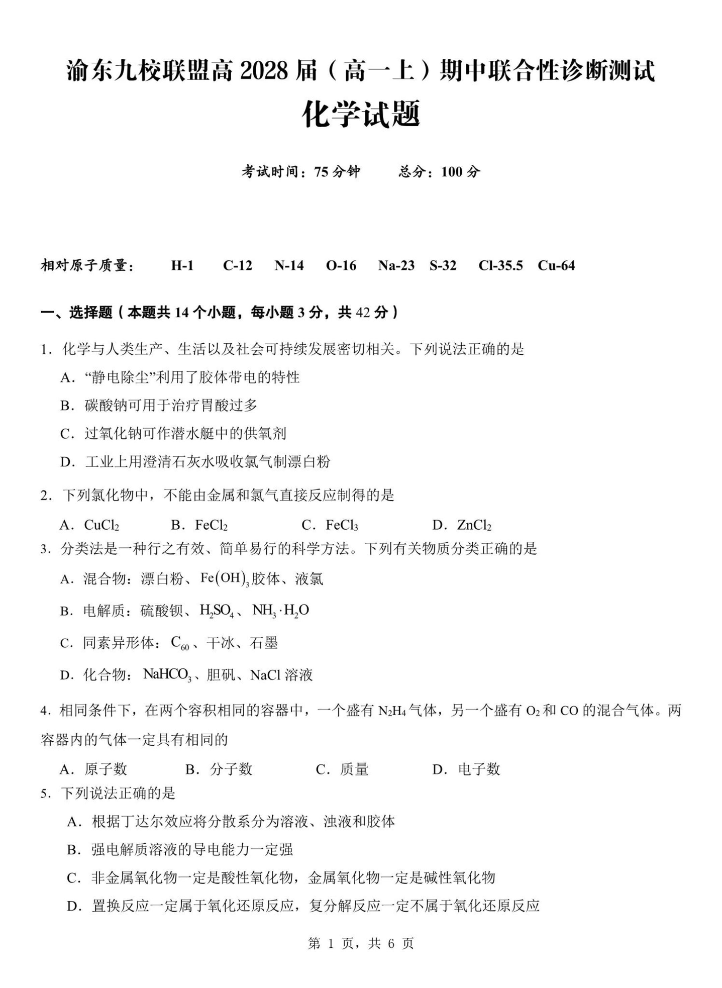 渝东九校联盟2028届(高一上)期中联合性诊断测试 化学试题(含答案).pdf