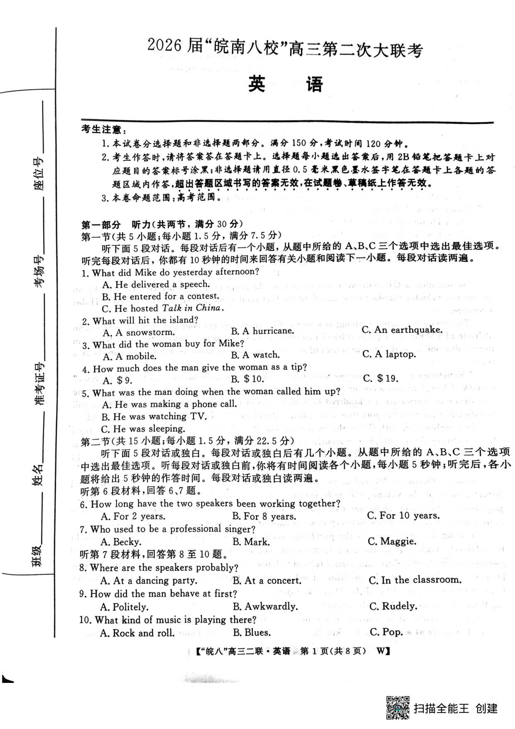 2026届“皖南八校”高三第二次大联考 英语.pdf
