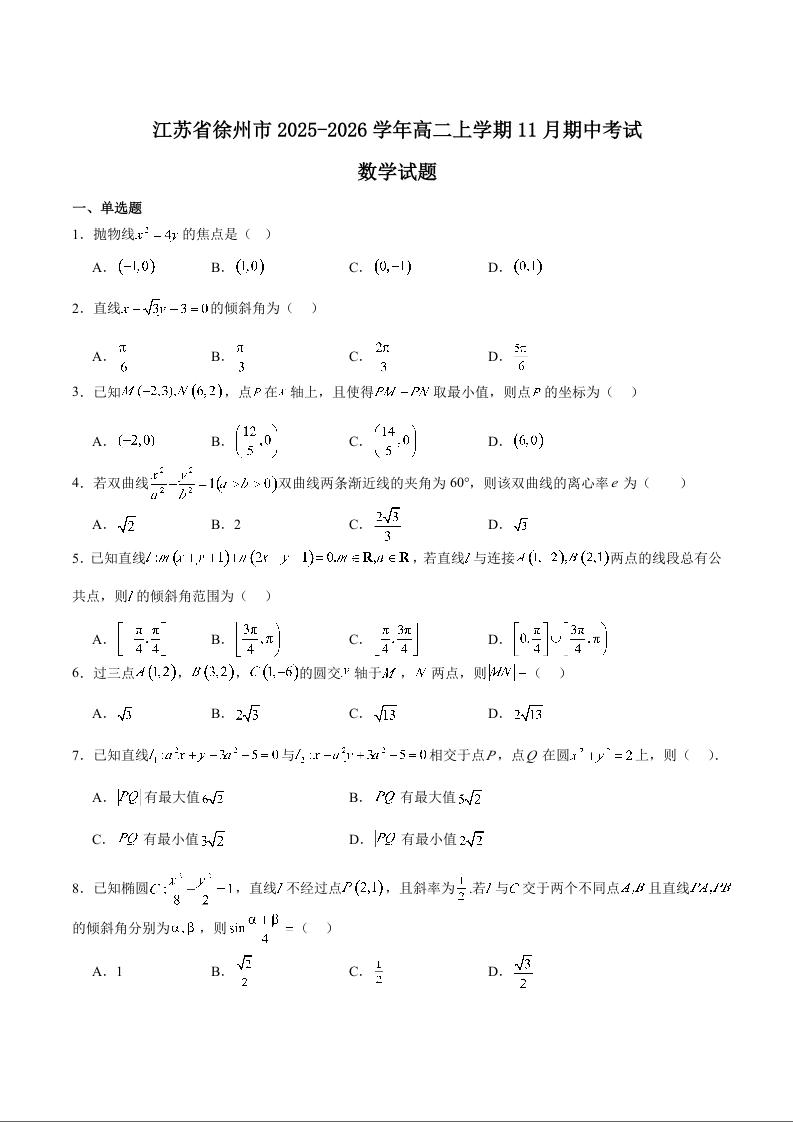 江苏省徐州市2025-2026学年高二上学期期中考试 数学试题(含答案).docx