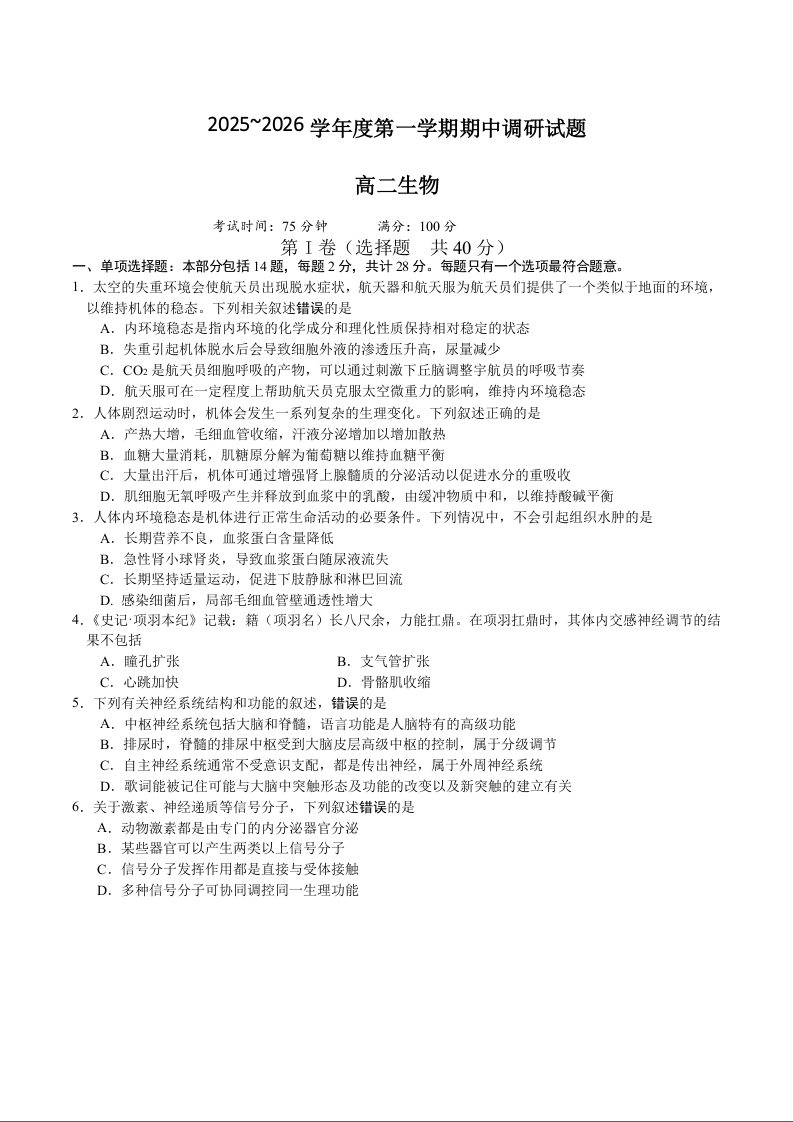 江苏省扬州市邗江区2025-2026学年高二上学期期中考试 生物试题(含答案).docx
