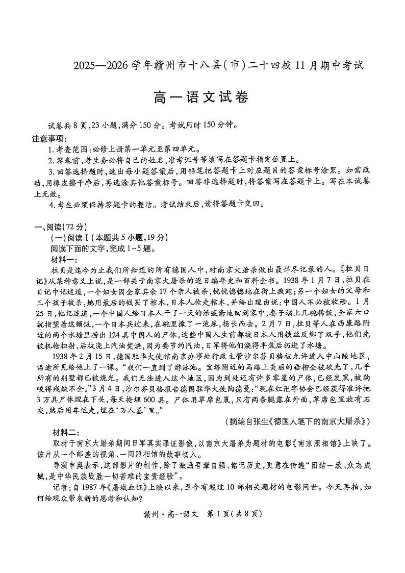 江西省2025-2026学年赣州市十八县(市)二十四校高一11月期中考试 语文试题(含答案).pdf