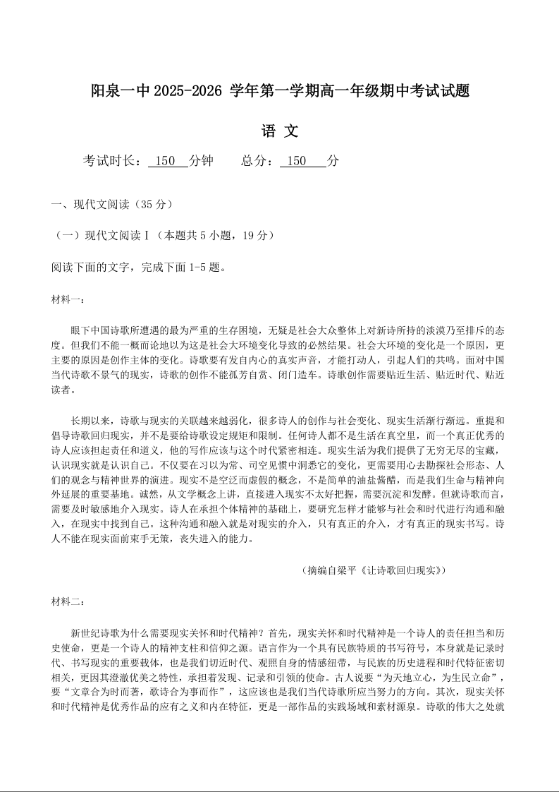 山西省阳泉市第一中学校2025-2026学年高一上学期期中考试 语文试题(含答案).docx