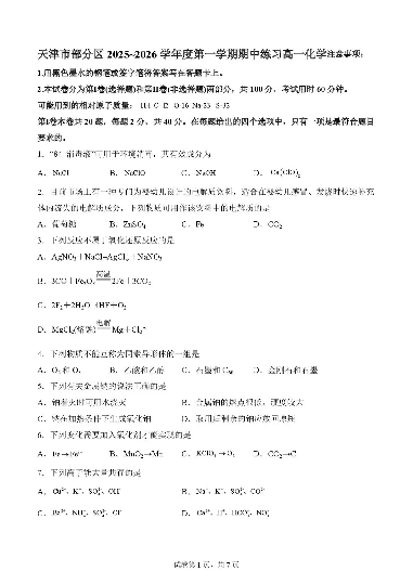 天津市部分区2025-2026学年高一上学期11月期中考试 化学试题(含答案).pdf