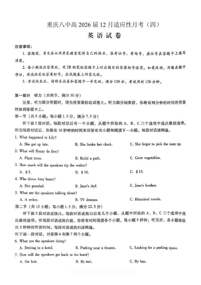 重庆市第八中学2026届高考适应性月考卷(四)英语.pdf