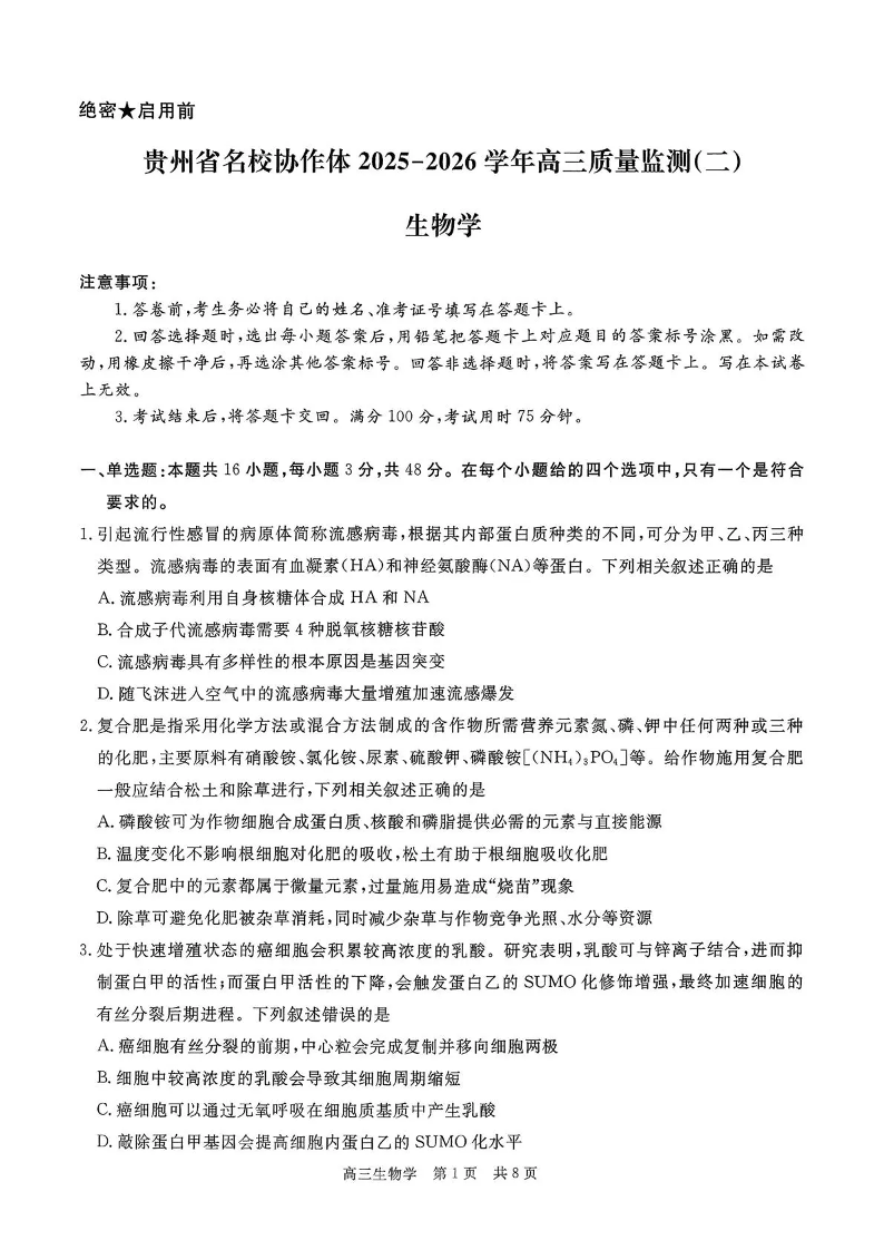 贵州省名校协作体2025-2026学年高三质量监测(二)生物.pdf