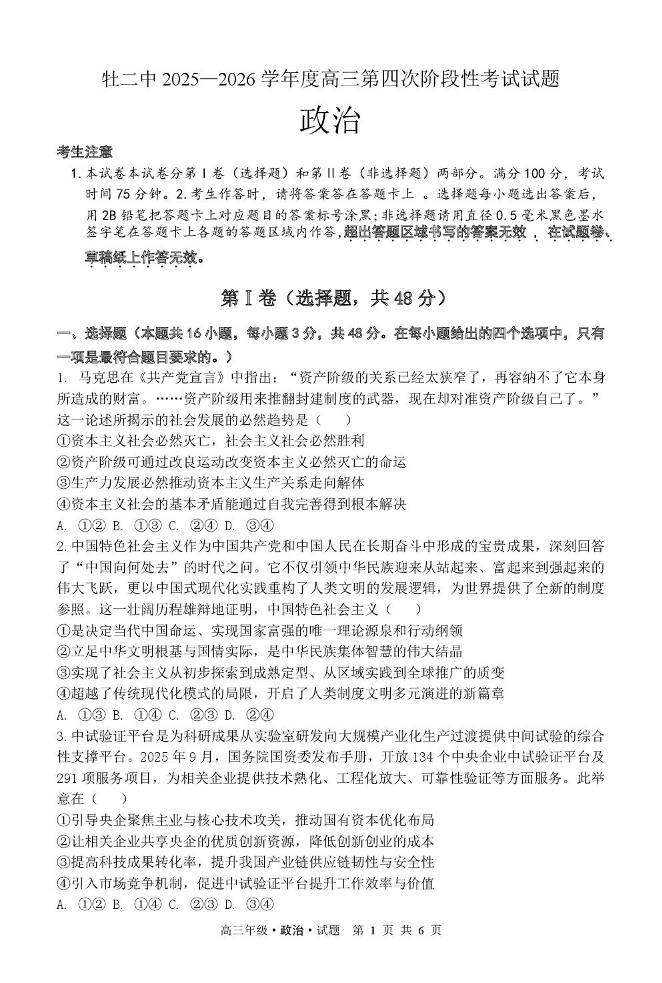 牡丹江市第二高级中学2026届高三第四次阶段性考试 政治.pdf