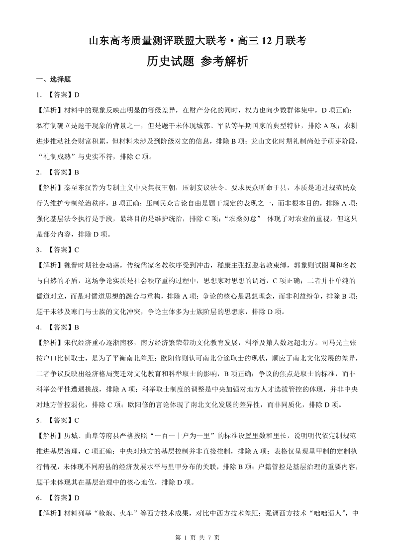山东高考质量测评联盟大联考·高三12月联考 历史答案.pdf
