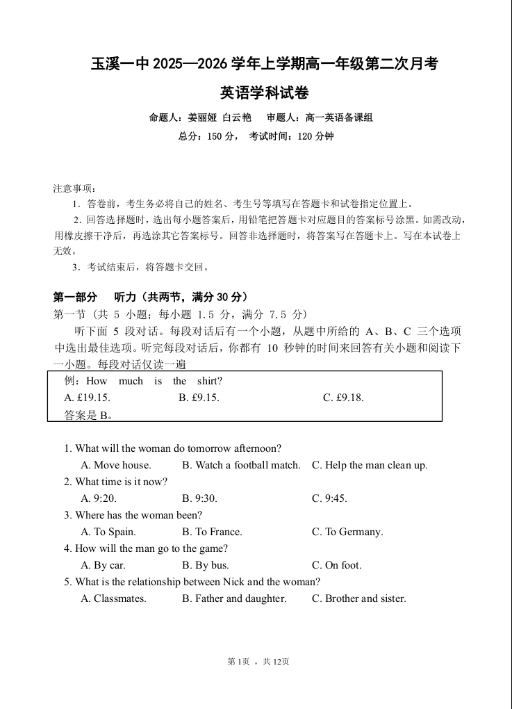 玉溪一中2025-2026学年高一上学期第二次月考 英语.docx