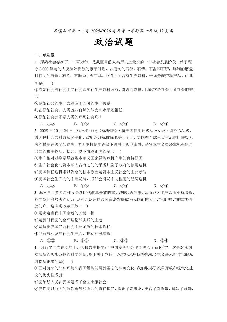 石嘴山市第一中学2025-2026学年高一年级12月月考 政治.docx