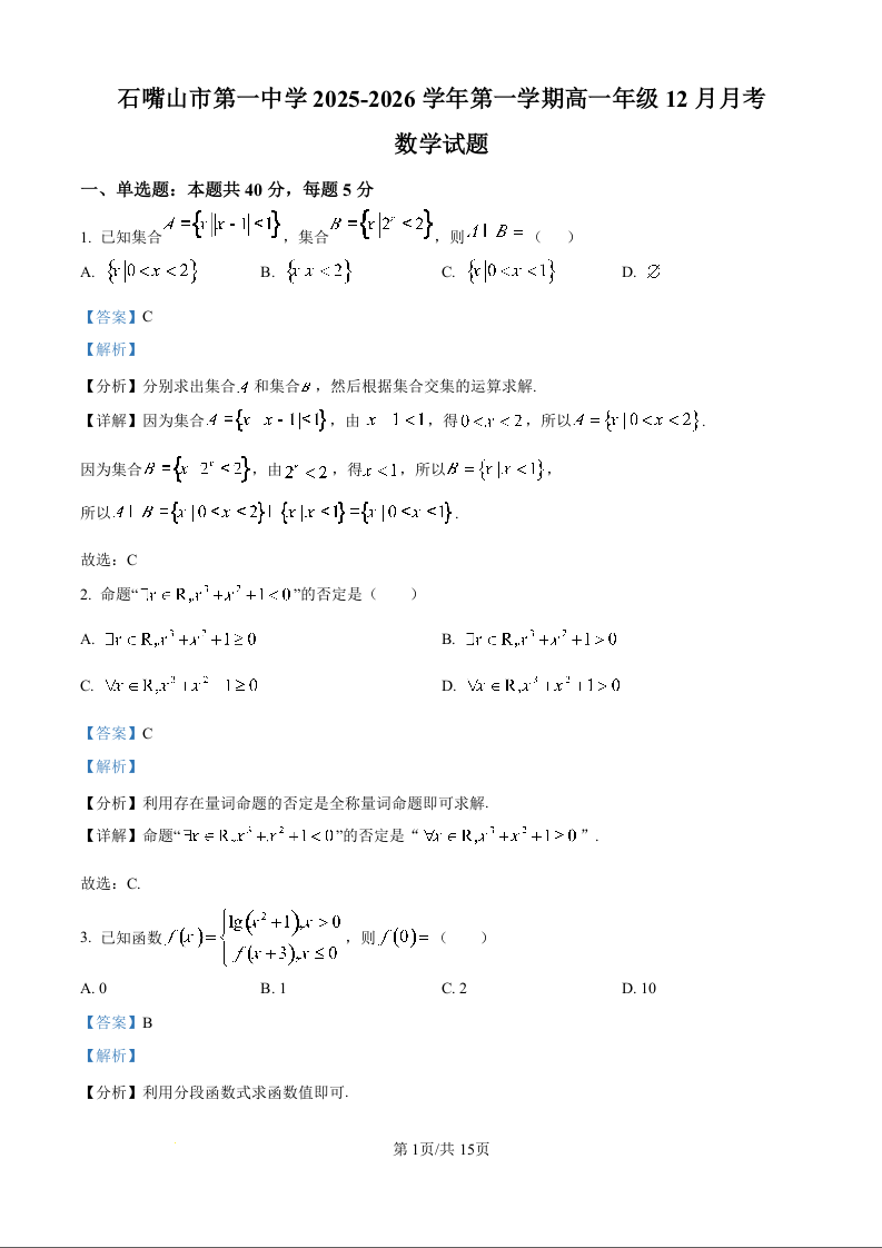 石嘴山市第一中学2025-2026学年高一年级12月月考 数学答案.docx