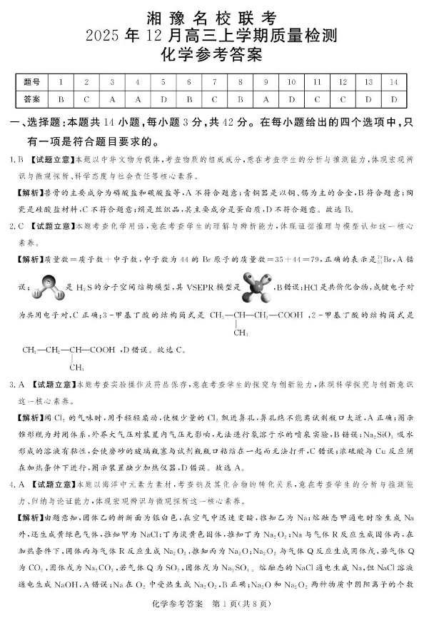 湘豫名校联考2025年12月高三上学期质量检测 化学答案.pdf