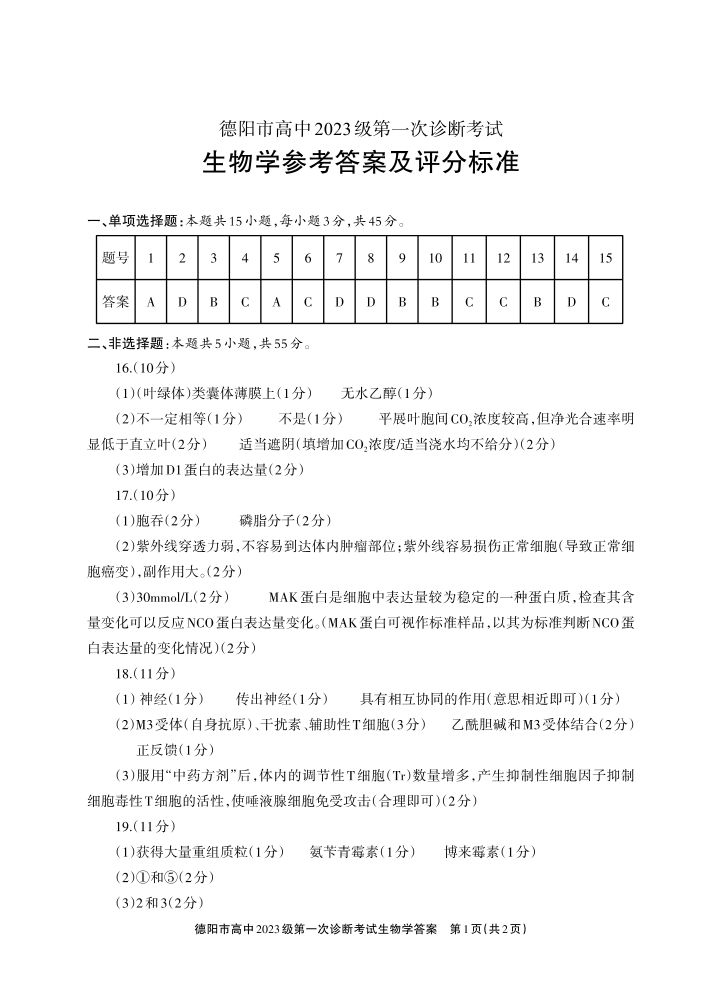德阳市高中2023级第一次诊断考试 生物答案.pdf