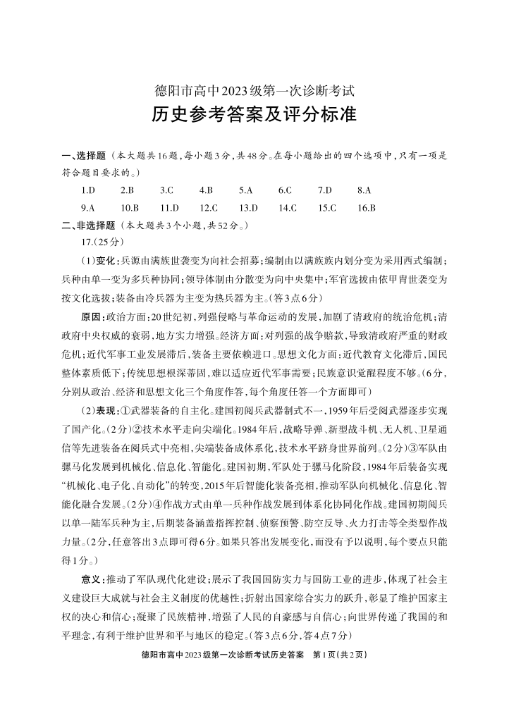 德阳市高中2023级第一次诊断考试 历史答案.pdf